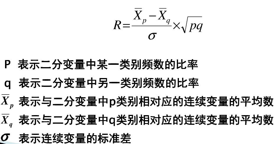 当两个变量其中一个是正态连续性变量,另一个是真正的二分名义变量(例如,男与女,已婚和未婚,色盲与非色盲,生与死,等等),这时,表示这两个变量之间的相关,称为点二列相关。