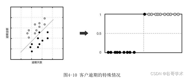 额,且黑色样本为非恶意逾期客户,灰色样本为恶意逾期客户。构建线性回归