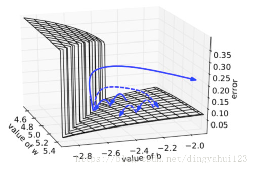 为了解决梯度爆炸问题,Thomas Mikolov首先提出了一个简单的启发性的解决方案,就是当梯度大于一定阈值的的时候,将它截断为一个较小的数。具体如算法1所述:算法:当梯度爆炸时截断梯度,下图可视化了梯度截断的效果。它展示了一个小的rnn(其中W为权值矩阵,b为bias项)的决策面。这个模型是一个一小段时间的rnn单元组成;实心箭头表明每步梯度下降的训练过程。当梯度下降过程中,模型的目标函数取得了较高的误差时,梯度将被送到远离决策面的位置。截断模型产生了一个虚线,它将误差梯度拉回到离原始梯度接近的位置。
