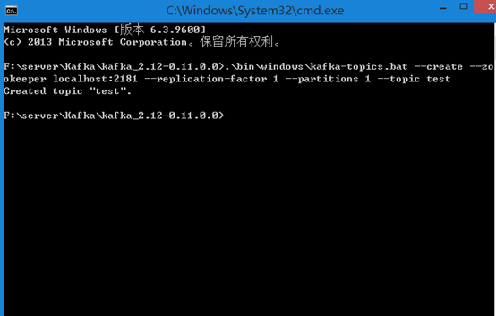.binwindowskafka-topics.bat --create --zookeeper localhost:2181 --replication-factor 1 --partitions 1 --topic test