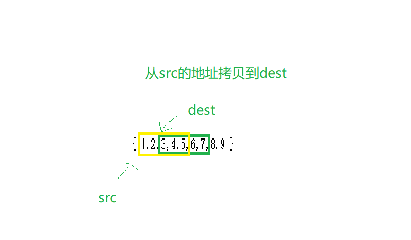 从这幅图上看要从后面打印才不会出现重复覆盖的问题,而判断也很简单明了,就是二个地址大小的比较,dest>src那就从后面开始打印 ,而dest<src那就从前到后打印,。
