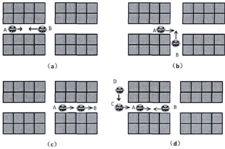 现有AGV的探测距离和扫描范围的限制以及其在仓库中较高的行驶速率,导致(b)中因为货架等的遮挡,使得A与B未能及时探测到彼此,因此会发生侧面冲突。