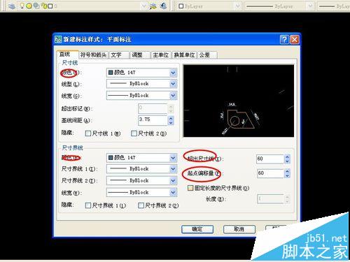 1、直线,打开,修改尺寸线颜色为147号色,尺寸界线颜色为147号色,超出尺寸线60,起点偏移量为60.