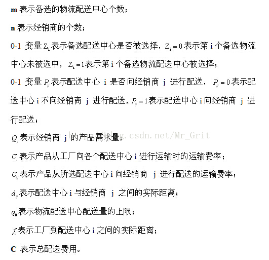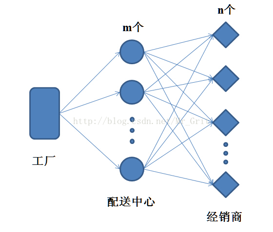有一个工厂生产的商品需要向n个经销商供货,向各地的经销商供货是通过配送中心,商品的物流为工厂 -> 配送中心 -> 经销商,现要选址确定配送中心,现有m个备选的配送中心,需要从备选的配送中心确定若干个,保证总的配送费用最低。