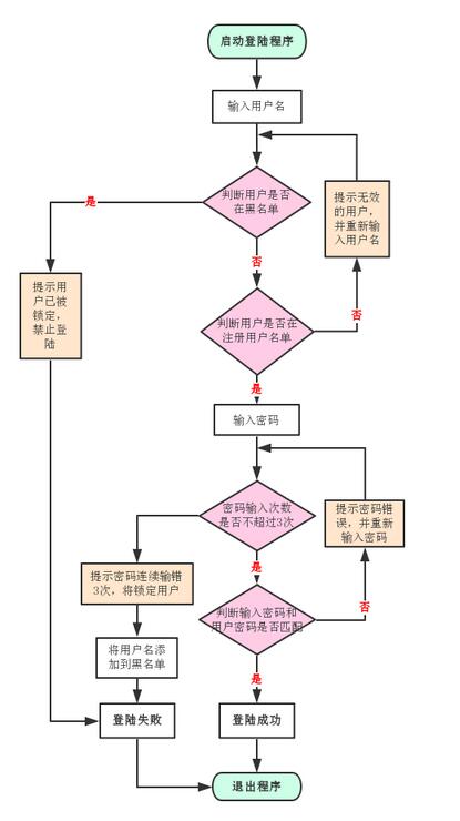 此程序模拟用户登录验证的过程,实现用户名输入、黑名单检测、用户有效性判别、密码输入及验证等。用户在3次以内输入正确密码登陆成功,连续输错3次密码登陆失败,且该用户名被记录在黑名单,黑名单中的用户被锁定不能再登陆。