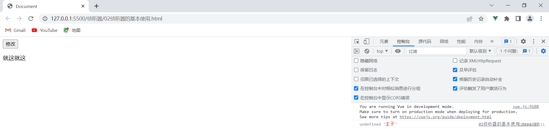 这边是用@click来绑定事件,然后用插值语法渲染了结果。在可以看到结果基础上,我们用监听器来监听数据是否变化,就在图片右侧我们可以看到原来未改变前的数据