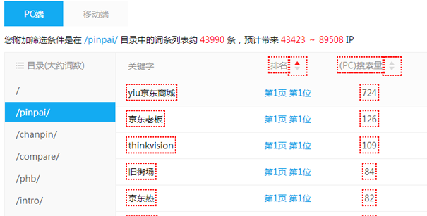 我们可以清晰的看到仅/pinpai/这个栏目页,就创建了仅4万条的关键词排名,预估可以带来4.3-8.9万个IP。