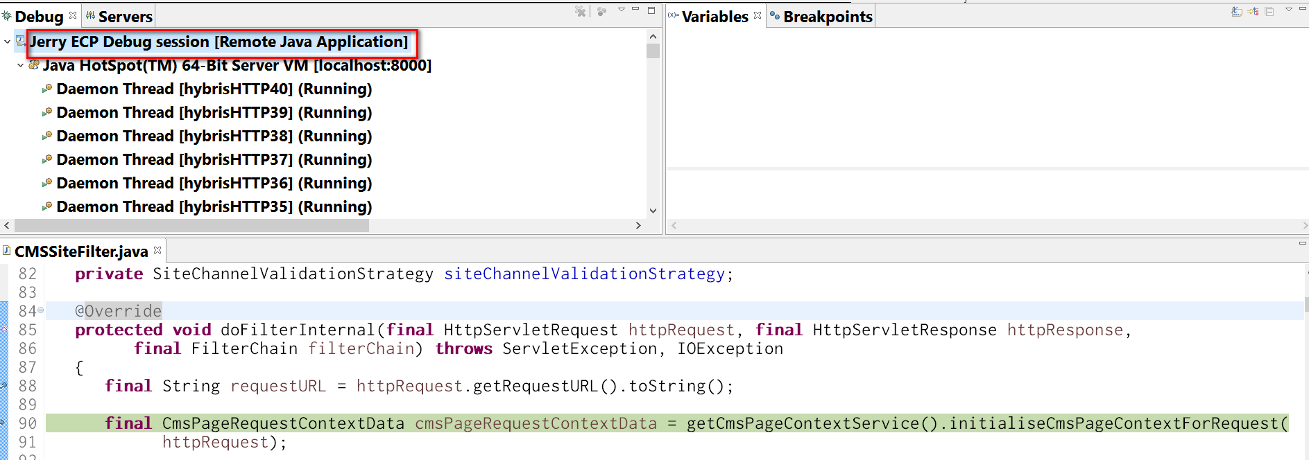 3. Set breakpoint in file binext-templateyacceleratorstorefrontwebsrcdehybrisplatformyacceleratorstorefrontfilterscmsCMSSiteFilter.java.