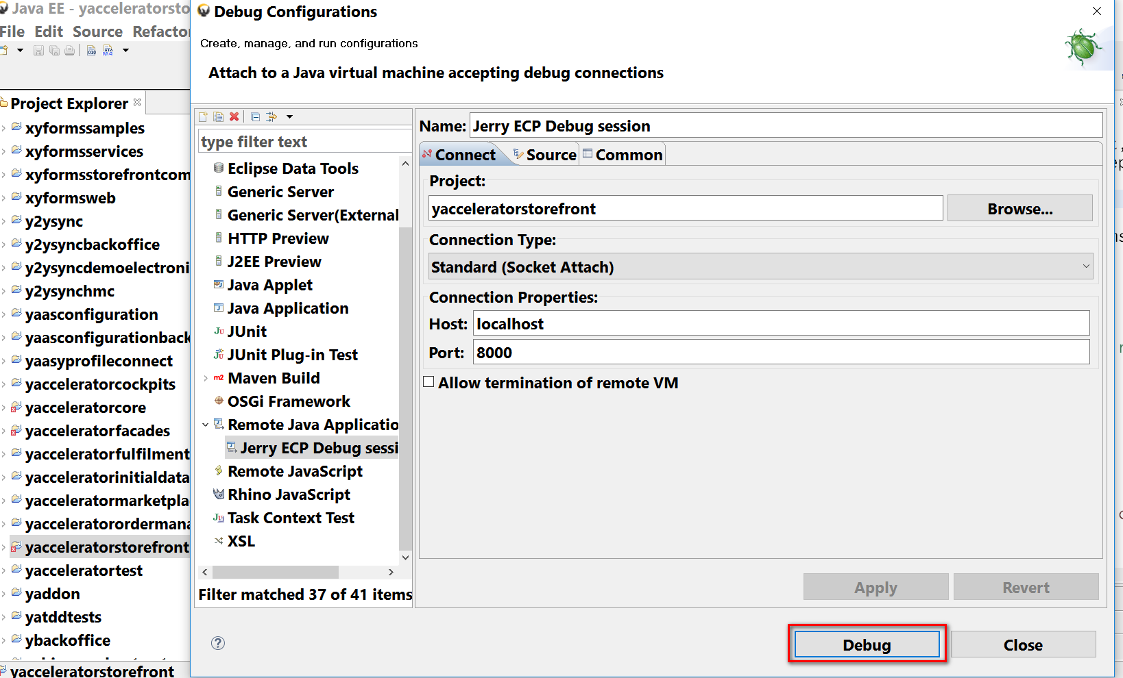 Choose Debug Configuration from context menu. Use Remote Java Application for debug configuration and connect to port 8000.
