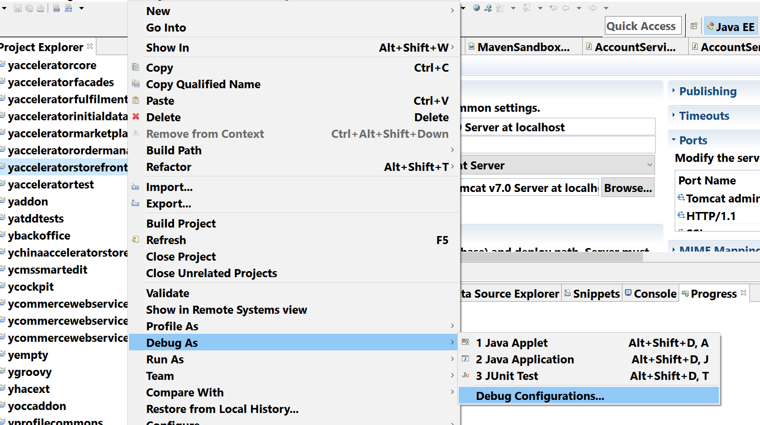 2. import folder hybrisbin into Eclipse. Right click on the extension you want to debug. In my example it is yacceleratorstorefront.