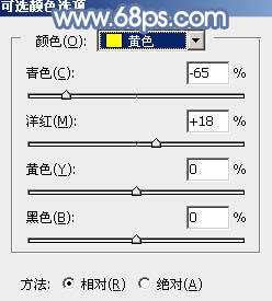1、打开素材图片,创建可选颜色调整图层,对黄色进行调整,参数及效果如下图。这一步给图片增加橙黄色。