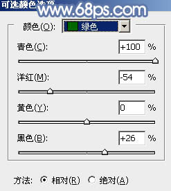 2、创建可选颜色调整图层,对黄色,绿色进行调整,参数设置如图3,4,效果如图5。这一步给图片增加橙红色。