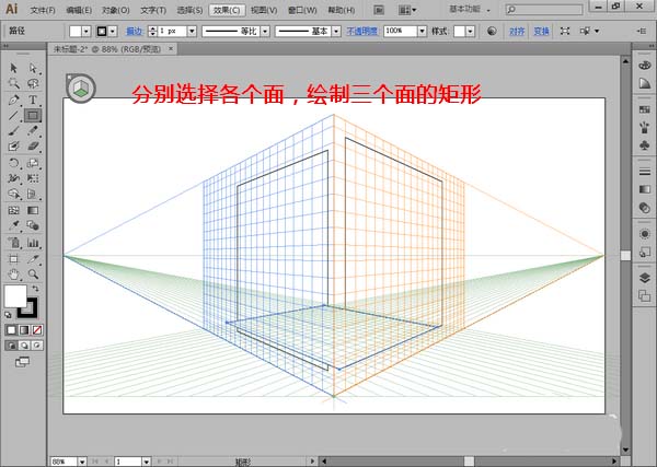 3、比如说,我们在小立方体上点击选择红色的面,然后再使用矩形工具在画面上进行绘制,它就会自动将矩形的透视关系映射到右侧的红色平面上。