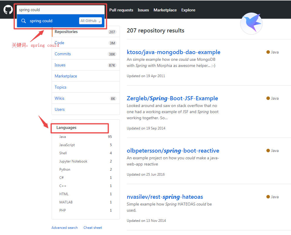 其中,红色箭头指的两个地方,分别是仓库的名称和描述。咱们可以直接限定关键字只查特定的地方。比如咱们只想查找仓库名称包含 Spring Cloud 的仓库,可以使用语法