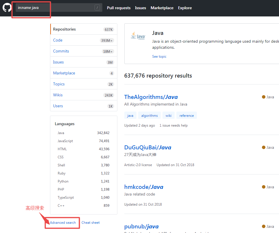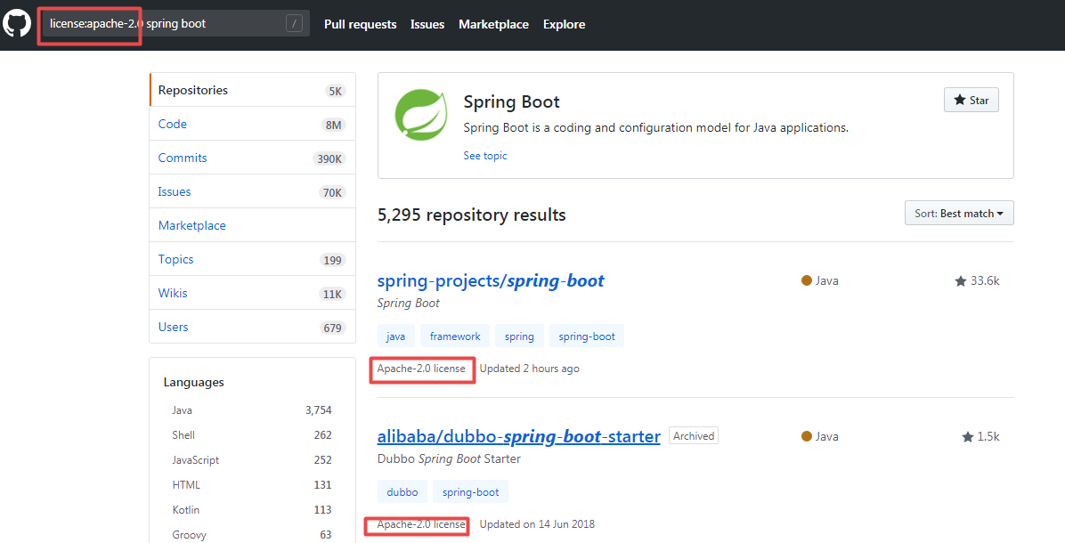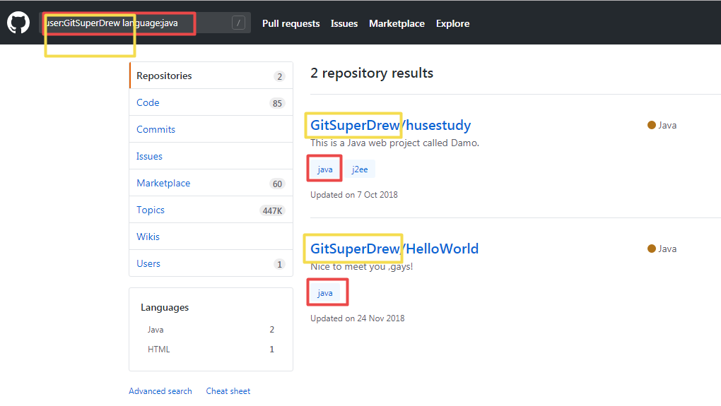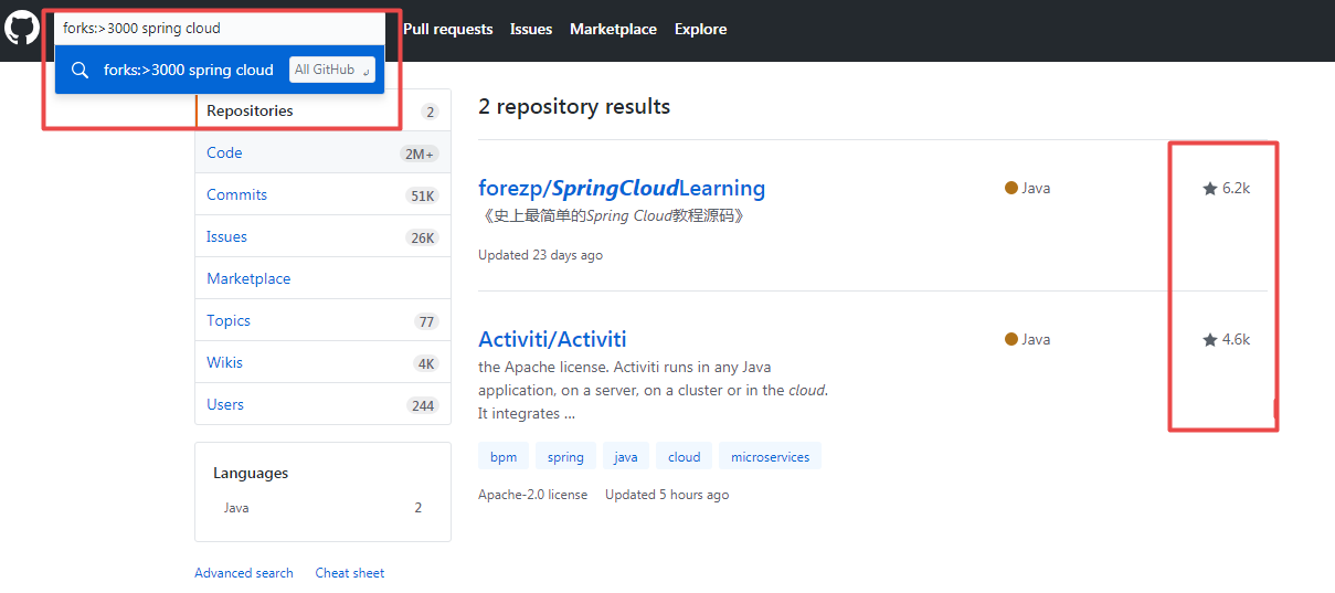 组合使用一下,把 Java 项目过滤出来,多个查询之间「空格」分隔即可。
