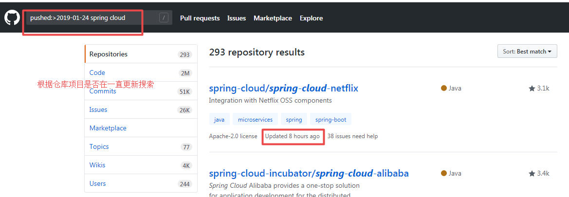 通过这样一条搜索 pushed:>2019-01-03 spring cloud