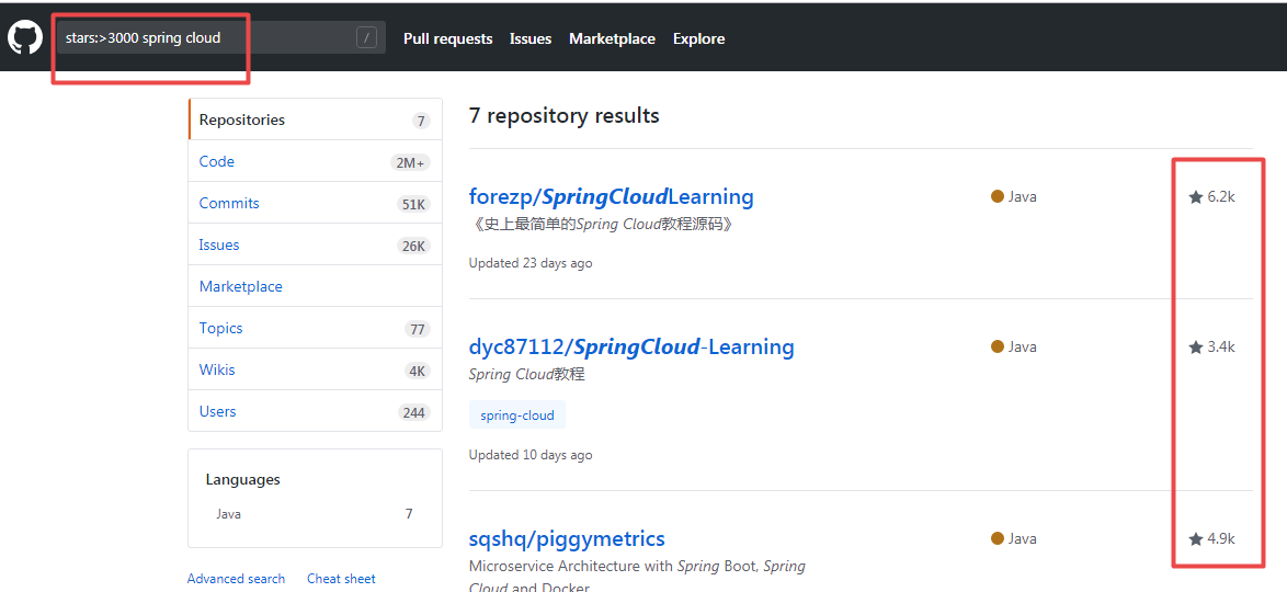 ① stars:> 数字 关键词【例如:stars:>3000 spring cloud】