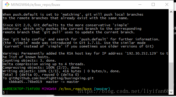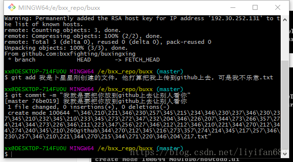 提交完成后,把它推送到远程仓库上去:git push git@github.com:bxxfighting/buxingxing.git