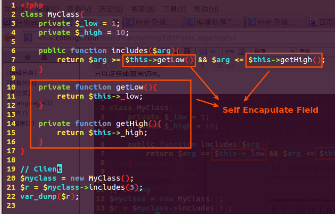 我自己的例子:我一般会把field设置成private,如果外部变量,需要用到此field的时候,我就会用Self Encapsulate Field。或者field的值有变化的时候,用Self Encapsulate Field。