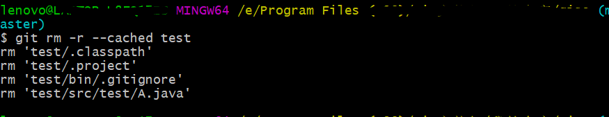 4、再输入命令 git rm -r --cached test 删除磁盘上的 test 文件