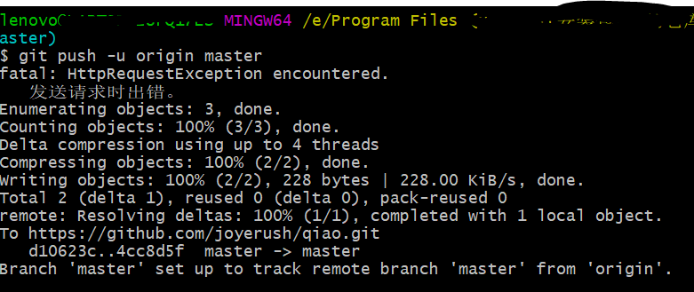 这里我出现了一个发送请求错误,但是不需要担心,你只需要按着git提示的步骤来输入你的GitHub的用户名(Username),密码(password)就可以了。等待一下,下面就会出现这样的代码就表示发送成功。