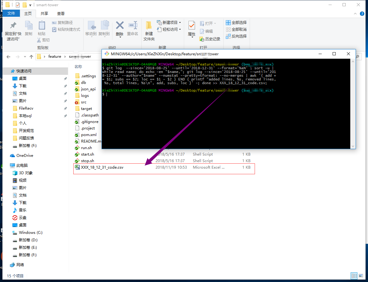 git log --since='2018-08-25' --until='2018-12-31' --format='%aN' | sort -u | while read name; do echo -en "$name,"; git log --since='2018-08-25' --until='2018-12-31' --author="$name" --numstat --pretty=tformat: --no-merges | awk '{ add += $1; subs += $2; loc += $1 - $2 } END { printf "added lines, %s, removed lines, %s, total lines, %sn", add, subs, loc }' -; done >> XXX_18_12_31_code.csv;