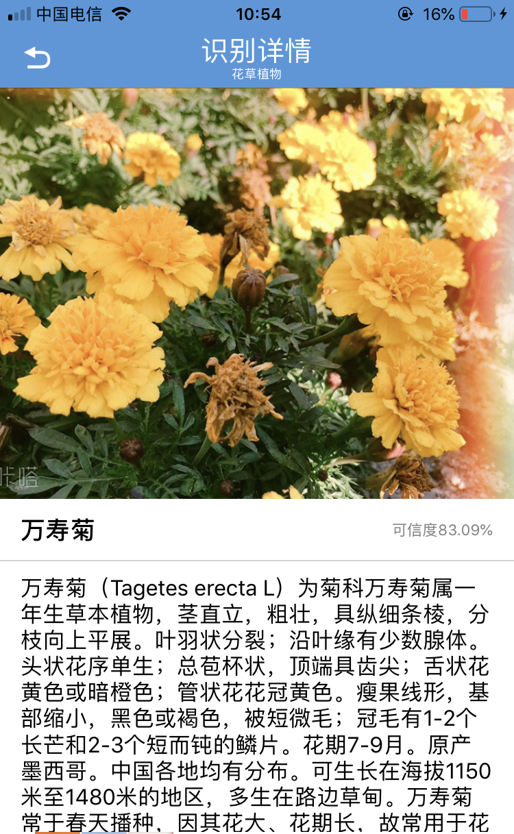 识别速度非常快,大概不到一秒,识别结果为万寿菊,置信度为83.09%。通过百度万寿菊,发现确实图中植物为万寿菊,识别正确!