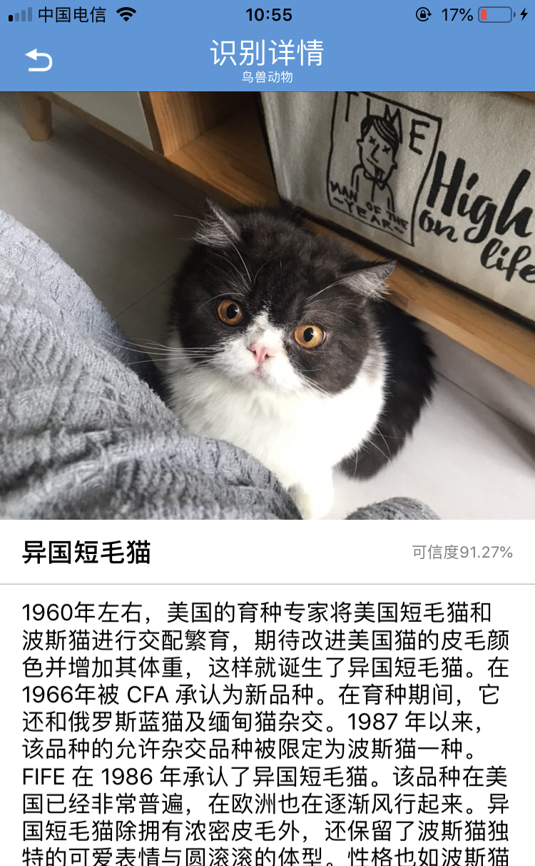 识别结果为异国短毛猫,拉到最下是可以看到分类的其他分数得分。其实呢,这只猫咪是混血的,不算真正纯种的异国短毛猫,但是这个分类结果是很正确的了。