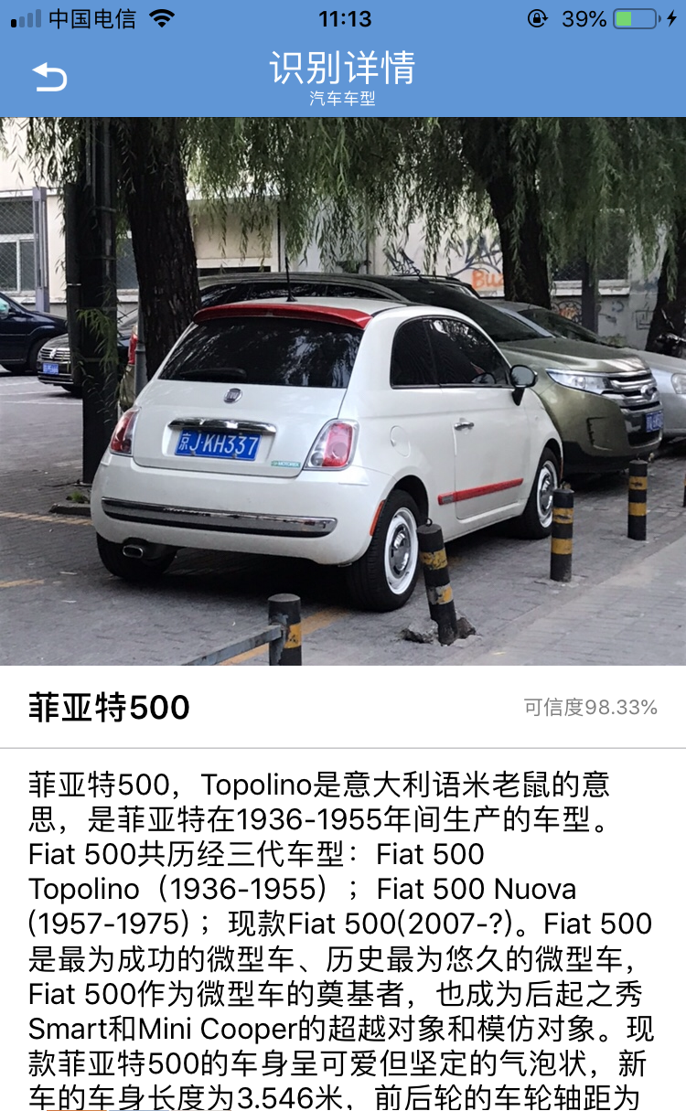 绝了,这辆车是比较少见的品牌以及车型,所以当时特意拍了下来,但是并不知道是什么具体车型,软件只用了一张图给出了置信度非常高的结果:菲亚特500。通过百度,确实是菲亚特500!有了识别全能王,再也不怕朋友说自己不懂车了!