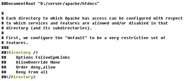 ①、找到这一行:DocumentRoot "D:/server/apache/htdocs",把以下这几行用#注释掉,如图: