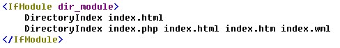 ③、找到这一行:DirectoryIndex index.html,在下面接着写上DirectoryIndex index.php index.html index.htm index.wml,如图: