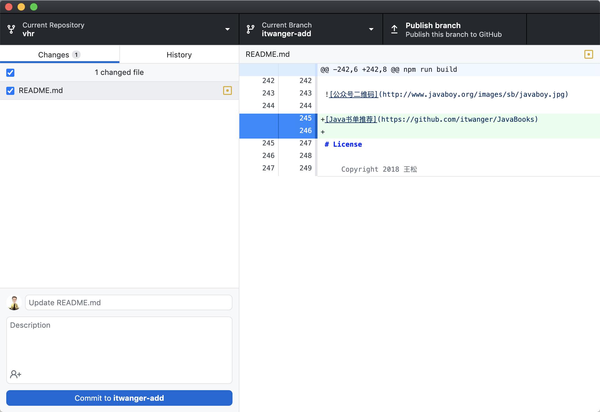 在摘要栏里填写信息后,点击「Commit to itwanger-add」。