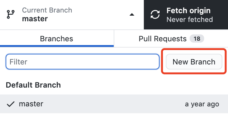 现在,来创建一个分支,点击「Current Branch」,然后在弹出式菜单上点击「New Branch」。