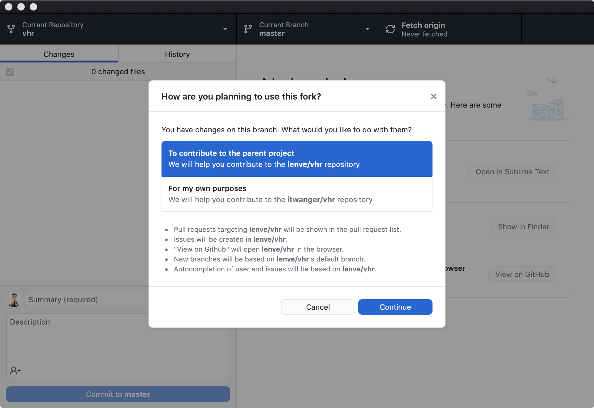 等待片刻,可能会比较慢,稍安勿躁,毕竟你懂。当出现下面这个提示(问你用这个项目干嘛,当然是成为项目的贡献者了,嘿嘿)的时候,点击「Continue」