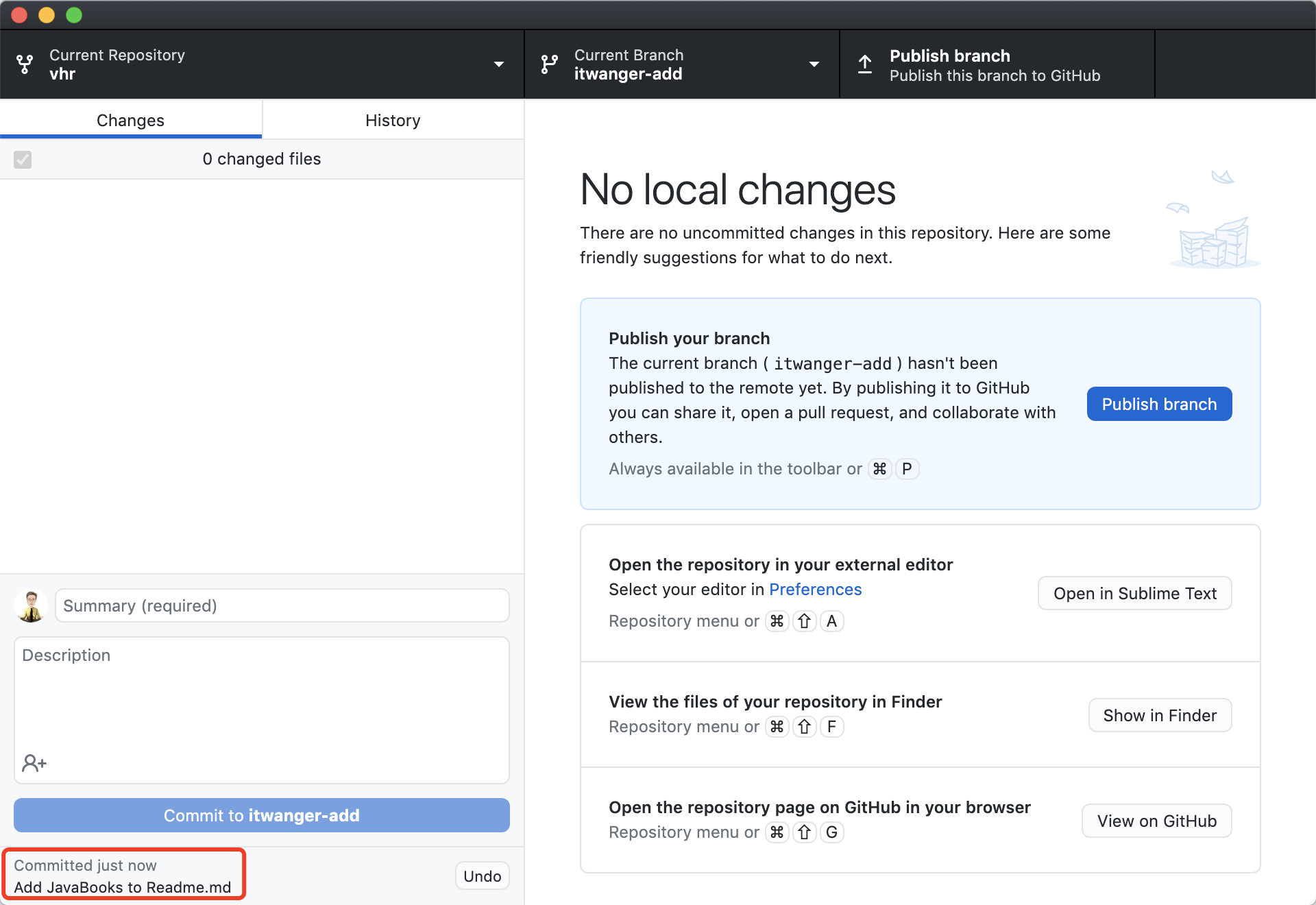 可以 GitHub 桌面版的底部看到修改内容已经提交了。