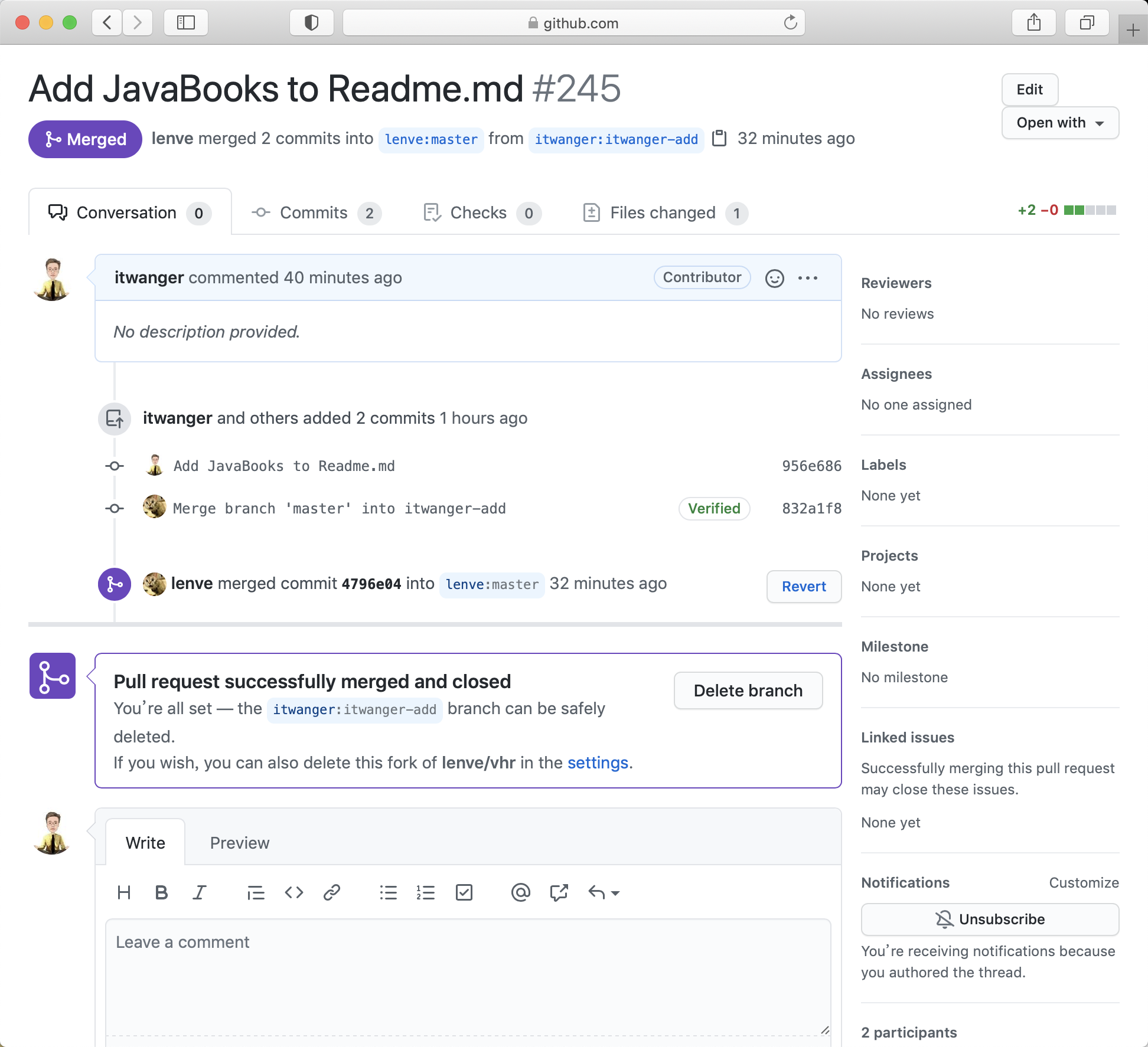 刷新一下当前的 PR,就可以看到 PR 已经成功 merge 了。