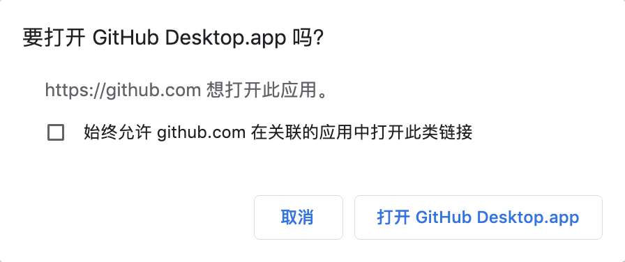 在弹出窗口上选择「打开 GitHub Desktop.app」.