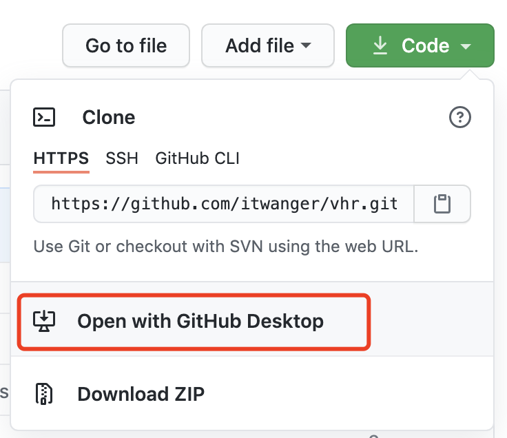 点击绿色的「Code」按钮,然后选择「Open with GitHub Desktop」。