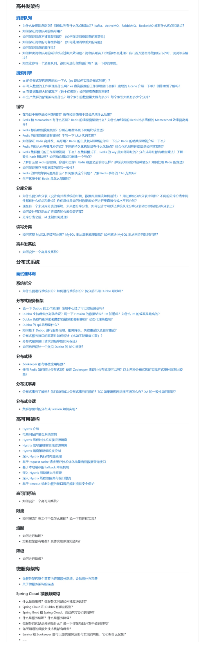 另外还有很多常见的技术问题,限于时间原因,没有办法全部放进去,比如JVM、数据库、Tomcat、分布式作业调度、Java并发包,等等,这些技术大家也需要自己平时多学习多积累,不是光依靠这个。