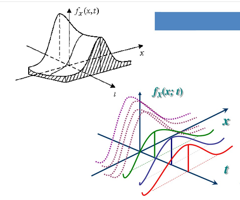 随机过程的本质有两个要点:一是随机,二是过程;随机说明任何时候结果都存在不确定性,即分布函数(或者概率密度函数);过程体现的是时间;在时间t时,随机变量服从某一分布,另一时刻随机变量服从某一分布;如图所示: