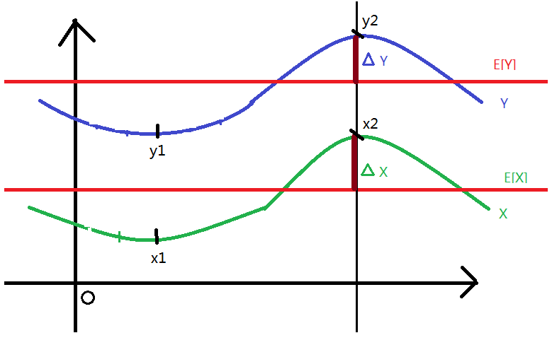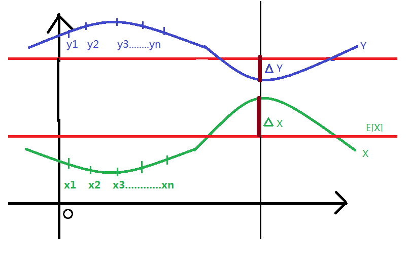 很明显上面图中X,Y两个随机变量所有的取值应该是正相关的,因为X,Y两个随机变量取值与均值差的正负性完全相同,那么总体上肯定就是正相关。就是上下波动性相同
