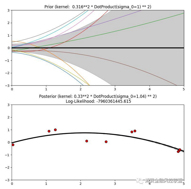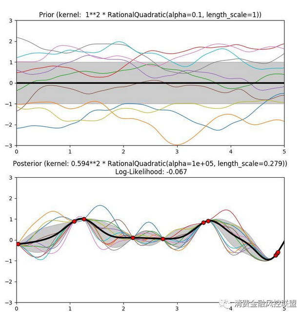 从 RBF 内核中产生的高斯过程的先验和后验如下图所示: