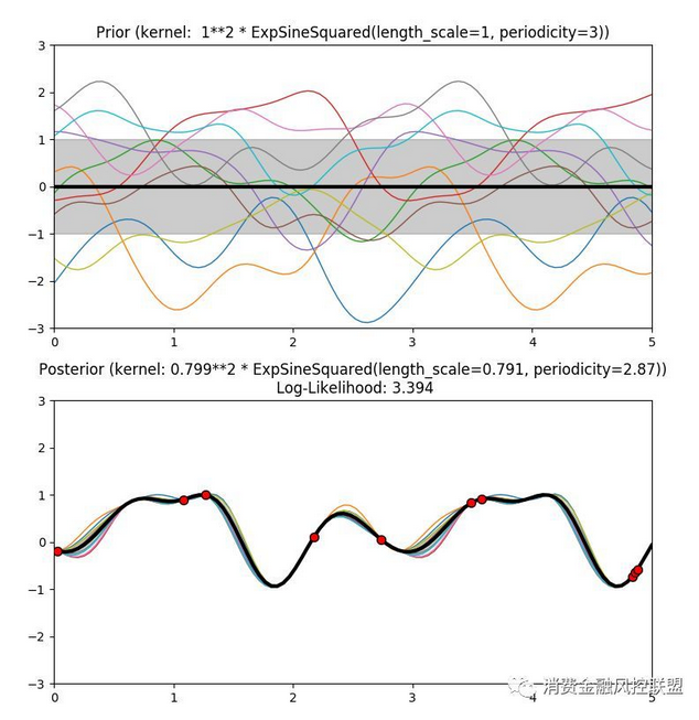 从ExpSineSquared内核中产生的高斯过程的先验和后验如下图所示: