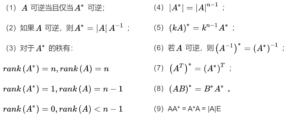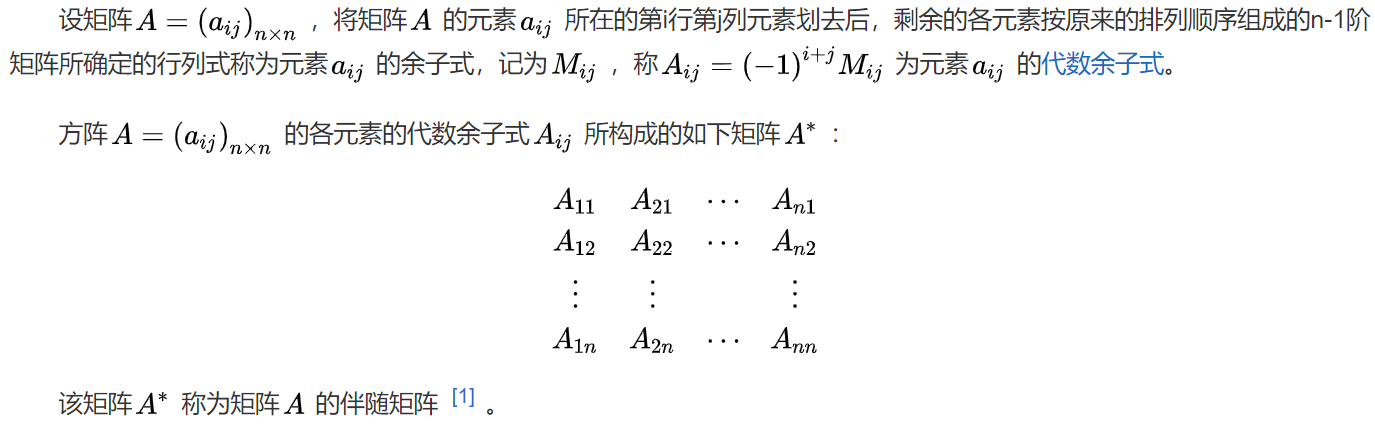 n阶行列式中,把元素 a i j a_{ij} aij 所在的第 i i i行和第 j j j列划去后,留下来的n-1阶行列式叫做元素 a i j a_{ij} aij 的余子式,记作 M i j M_{ij} Mij,将余子式 M i j M_{ij} Mij 再乘以-1的 i + j i+j i+j 次幂记为 A i j A_{ij} Aij, A i j A_{ij} Aij 叫做元素 a i j a_{ij} aij 的代数余子式。 - 伴随矩阵:方阵A的各元素的代数余子式构成的矩阵称为伴随矩阵。