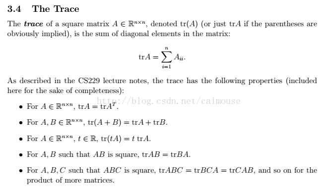 在学习andrew ng的深度学习公开课里,可看到一段与数据的矩阵相关的,这里提出了求trace的算法以及规则,虽然学习过高数,线代,概率论,还有数理方程等等,但还是没有什么印象,一脸迷茫。这段相关的文本,我放到这里,如下: