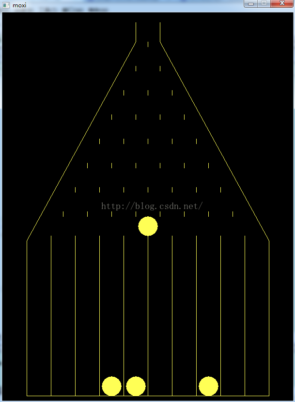 出于兴趣,在VC编译环境下,通过C++语言,模拟实现了高尔顿钉板的概率模型。本程序中定义了两个类,Ball和Holder类,Ball 是定义的小球类,Holder是定义的钉板类。Holder类主要负责画图显现模板框架,以及当一个小球滚到钉板下面容器位置,将小球放在合适的位置,并且当整个容器满的时候,即停止程序运行。小球类,定义了小球所处位置,并对小球进行作图。另外定义了根据传入的参数的移动规则,即,向左或者向右移动。另外定义了一个control函数,来控制holder和Ball类对象之间的交互,并且达到动态效果