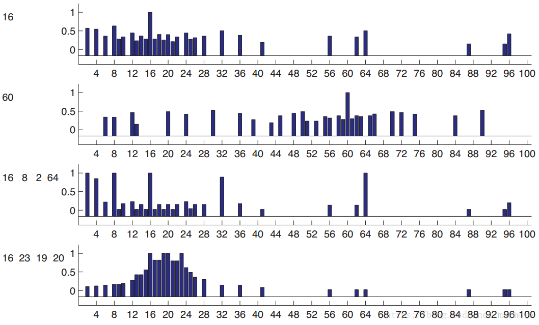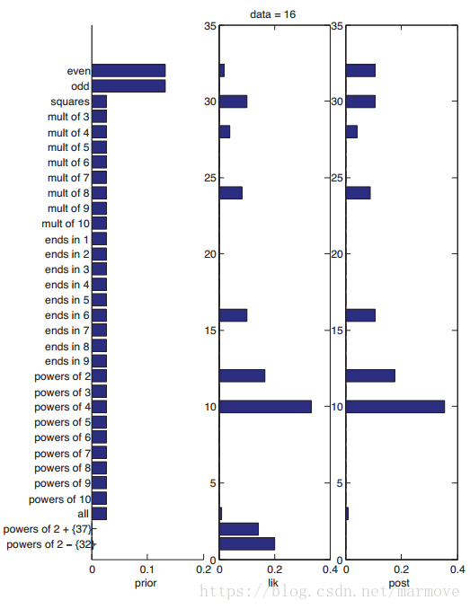 最左边是先验,我们看到,对于奇数和偶数因为发生的概率确实大一点,所以先验比较大,其余很多概念一样,最后类似于2的指数除去32这种概念,先验是非常小的。