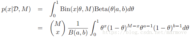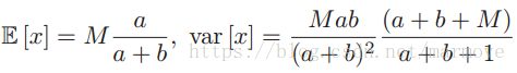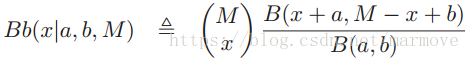 这个后面可以看做Beta(x+a,M-x+b)的积分,根据Beta分布的形式,很容易得到。那么最终这个x的后验分布就可以叫做beta-binomial分布: