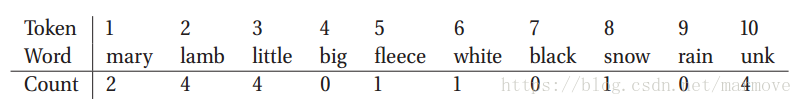 上面的方法基于狄里克雷-多项分布模型,在语言模型中经常会用到。就是给你一串单词,你去预测下一个单词是什么。比如我们有如下的一系类单词:Mary had a little lamb, little lamb, little lamb. Mary had a little lamb, its fleece as white as snow. 对于词袋模型而言,我们需要知道词袋是什么:mary, lamb, little, big, fleece, white, black, snow, rain, unknown.总共这10类(标记为1,2,3,...,10)。一方面在这里没有考虑如;a, as,the这些没什么意思的单词,另一方面我们只考虑原形,比如过去式或者单复数都是一个单词。我们假设每一次单词的采样都是完全独立的,那么对于单次采样,就服从分布。对于两个句子用数字表示为:1 10 3 2 3 2 3 2 1 10 3 2 10 5 10 6 8。在这个模型中,我们不考虑顺序,直接从计数的角度出发,这就与我们之前的模型一样的。我们统计一下单次出现的数目:
