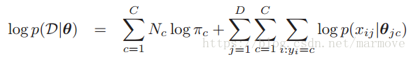 在实际计算的时候,尤其是在利用贝叶斯公式2.13的时候,有些项的值可能会非常的小,这样有可能造成数值下溢。所以我们对于贝叶斯法则取log: